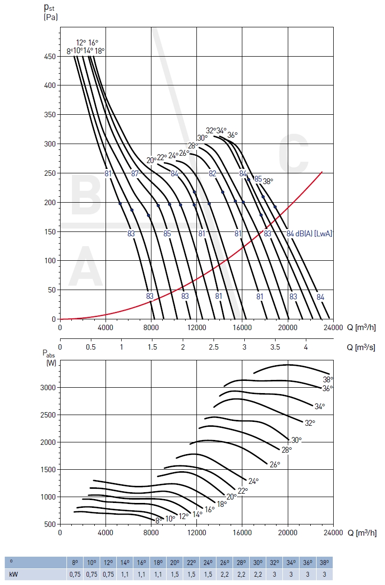 ![]() | Oběžné kolo Oběžné kolo má lopatky z Al slitiny a náboj z ocelového plechu. Oběžné kolo je staticky i dynamicky vyváženo. Nastavení úhlu listů oběžného kola je provedeno výrobcem. Počet lopatek 3, 6 nebo 9. | |