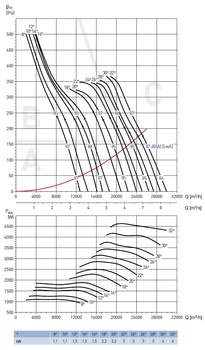 ![]() | Oběžné kolo Oběžné kolo má lopatky z Al slitiny a náboj z ocelového plechu. Oběžné kolo je staticky i dynamicky vyváženo. Nastavení úhlu listů oběžného kola je provedeno výrobcem. Počet lopatek 3, 6 nebo 9. | |