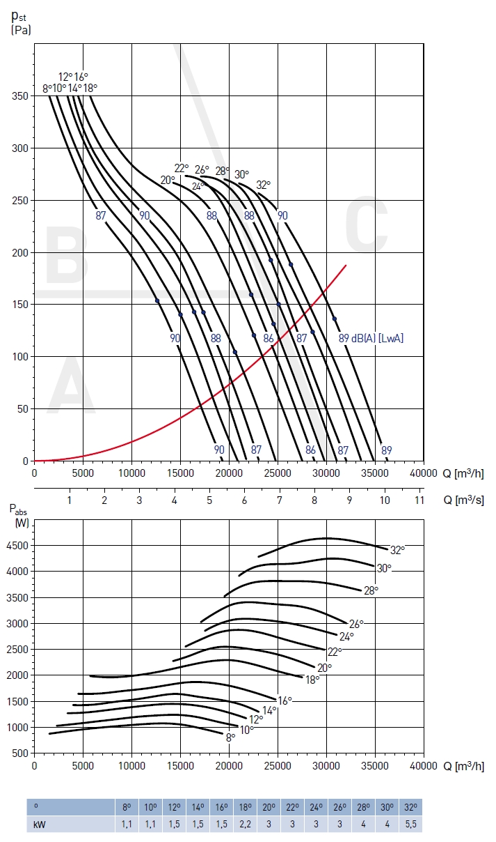 ![]() | Oběžné kolo Oběžné kolo má lopatky z Al slitiny a náboj z ocelového plechu. Oběžné kolo je staticky i dynamicky vyváženo. Nastavení úhlu listů oběžného kola je provedeno výrobcem. Počet lopatek 3, 6 nebo 9. | |