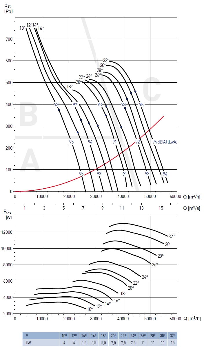 ![]() | Oběžné kolo Oběžné kolo má lopatky z Al slitiny a náboj z ocelového plechu. Oběžné kolo je staticky i dynamicky vyváženo. Nastavení úhlu listů oběžného kola je provedeno výrobcem. Počet lopatek 3, 6 nebo 9. | |