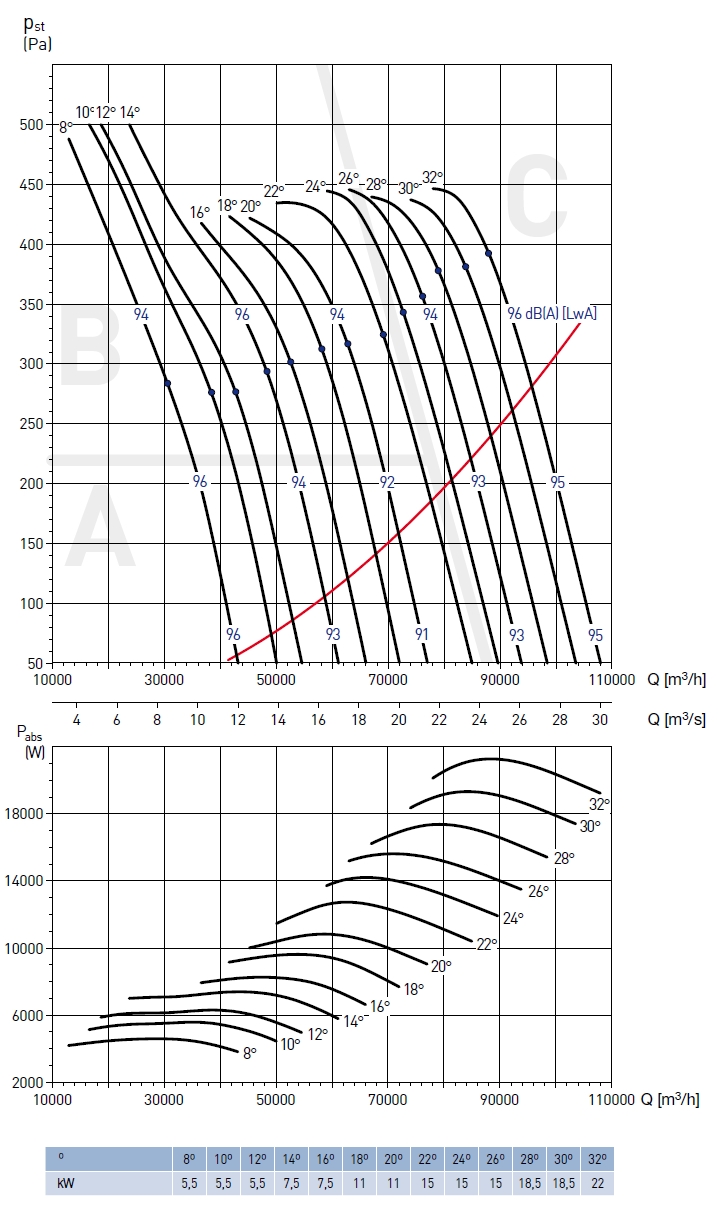 ![]() | Oběžné kolo Oběžné kolo má lopatky z Al slitiny a náboj z ocelového plechu. Oběžné kolo je staticky i dynamicky vyváženo. Nastavení úhlu listů oběžného kola je provedeno výrobcem. Počet lopatek 3, 6 nebo 9. | |