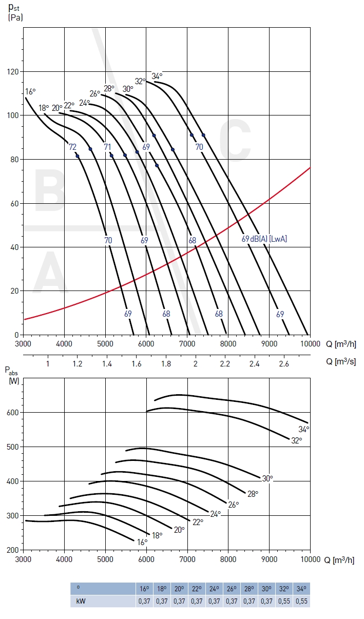 ![]() | Oběžné kolo Oběžné kolo má lopatky z Al slitiny a náboj z ocelového plechu. Oběžné kolo je staticky i dynamicky vyváženo. Nastavení úhlu listů oběžného kola je provedeno výrobcem. Počet lopatek 3, 6 nebo 9. | |