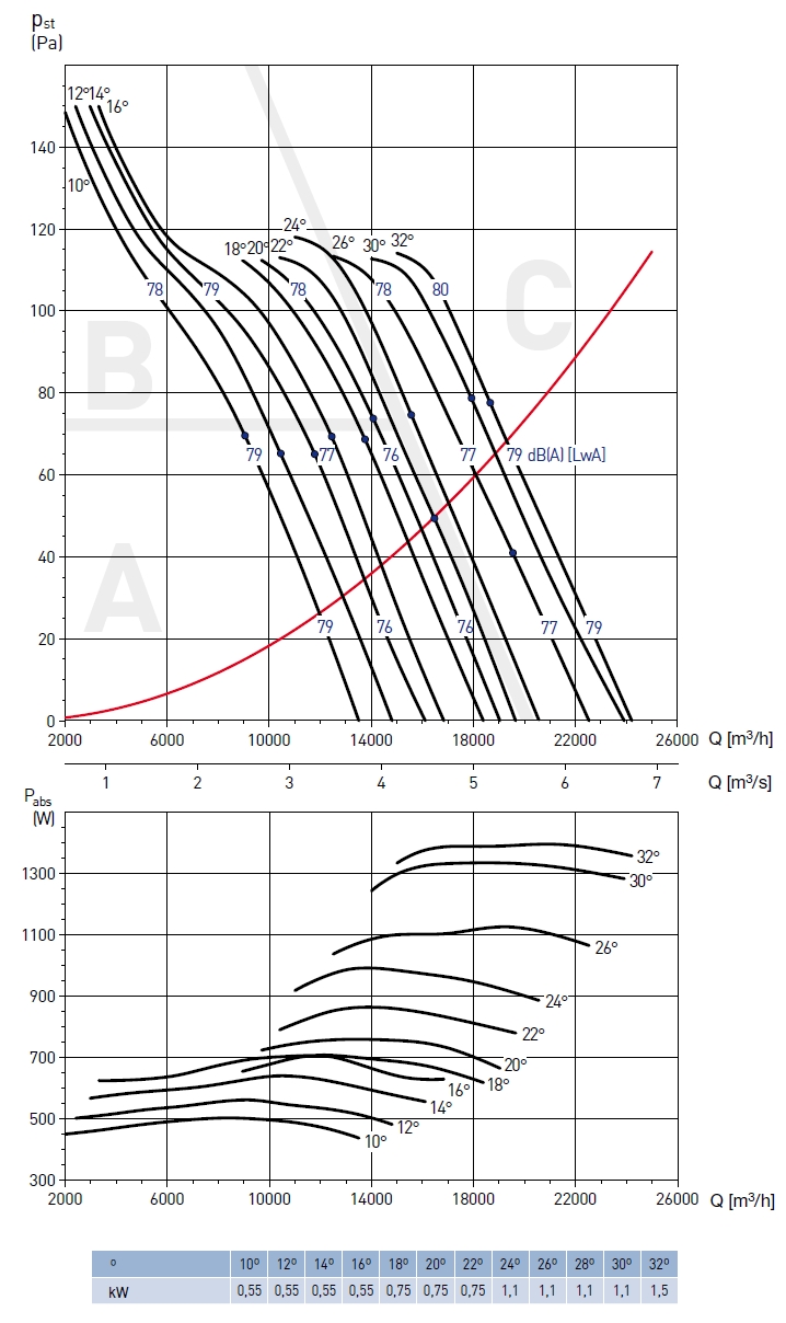 ![]() | Oběžné kolo Oběžné kolo má lopatky z Al slitiny a náboj z ocelového plechu. Oběžné kolo je staticky i dynamicky vyváženo. Nastavení úhlu listů oběžného kola je provedeno výrobcem. Počet lopatek 3, 6 nebo 9. | |