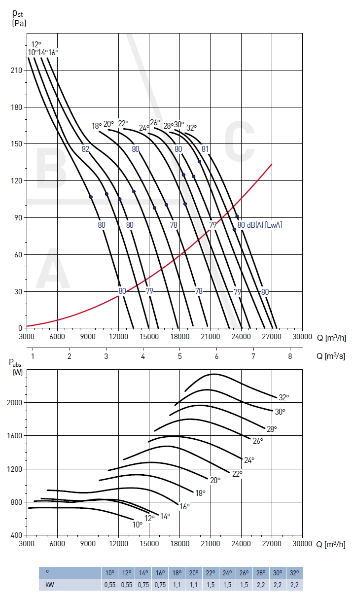 ![]() | Oběžné kolo Oběžné kolo má lopatky z Al slitiny a náboj z ocelového plechu. Oběžné kolo je staticky i dynamicky vyváženo. Nastavení úhlu listů oběžného kola je provedeno výrobcem. Počet lopatek 3, 6 nebo 9. | |