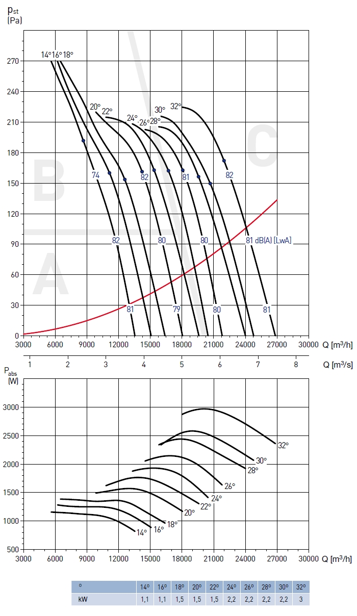 ![]() | Oběžné kolo Oběžné kolo má lopatky z Al slitiny a náboj z ocelového plechu. Oběžné kolo je staticky i dynamicky vyváženo. Nastavení úhlu listů oběžného kola je provedeno výrobcem. Počet lopatek 3, 6 nebo 9. | |