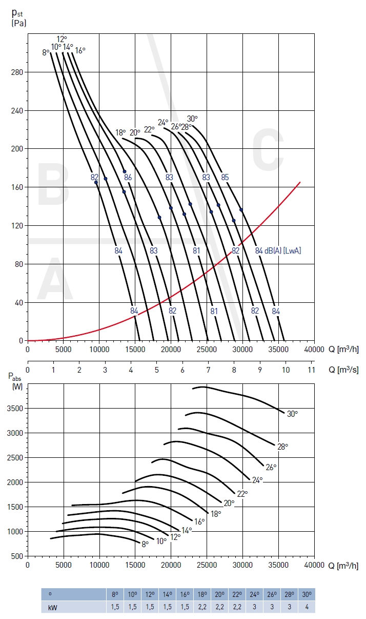 ![]() | Oběžné kolo Oběžné kolo má lopatky z Al slitiny a náboj z ocelového plechu. Oběžné kolo je staticky i dynamicky vyváženo. Nastavení úhlu listů oběžného kola je provedeno výrobcem. Počet lopatek 3, 6 nebo 9. | |