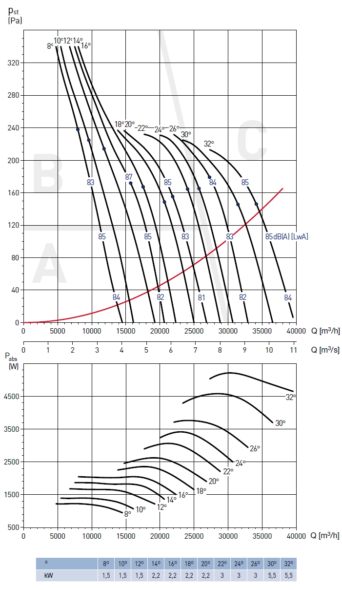 ![]() | Oběžné kolo Oběžné kolo má lopatky z Al slitiny a náboj z ocelového plechu. Oběžné kolo je staticky i dynamicky vyváženo. Nastavení úhlu listů oběžného kola je provedeno výrobcem. Počet lopatek 3, 6 nebo 9. | |