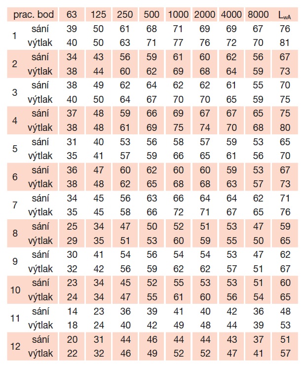* akustický tlak je měřen ve vzdálenosti 3 m v bodě 2 výkonové křivky (sání/výtlak)