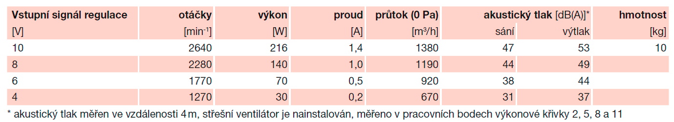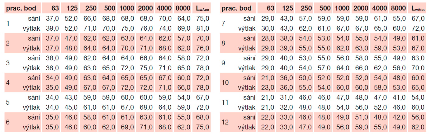 * akustický tlak měřen ve vzdálenosti 4 m, střešní ventilátor je nainstalován, měřeno v pracovních bodech výkonové křivky 2, 5, 8 a 11