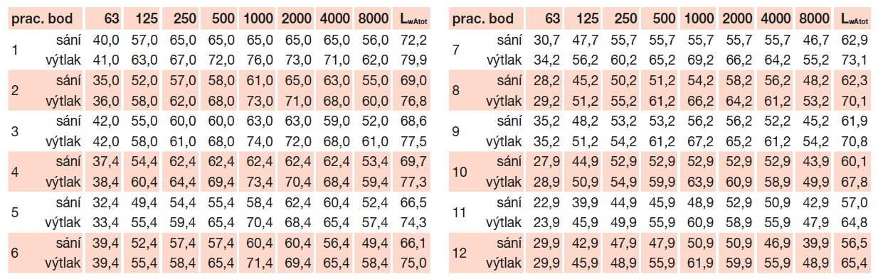 * akustický tlak měřen ve vzdálenosti 4 m, střešní ventilátor je nainstalován, měřeno v pracovních bodech výkonové křivky 2, 5, 8 a 11