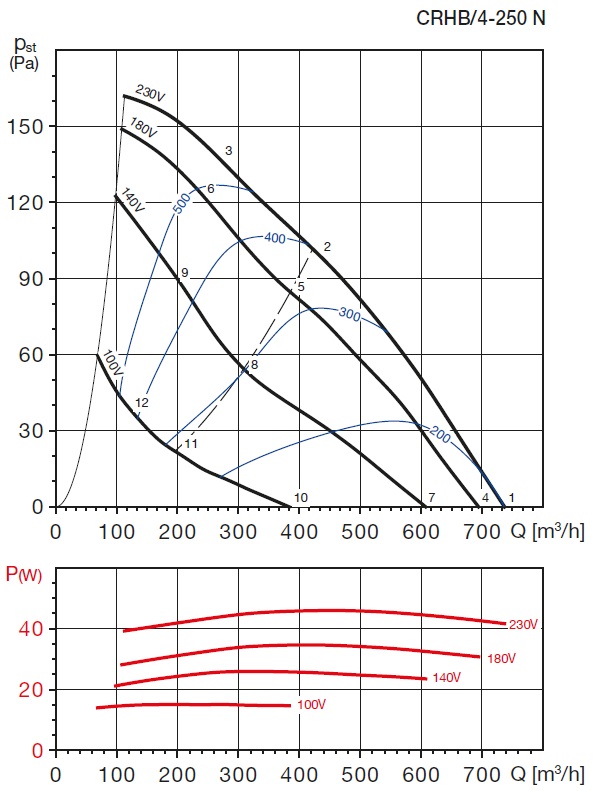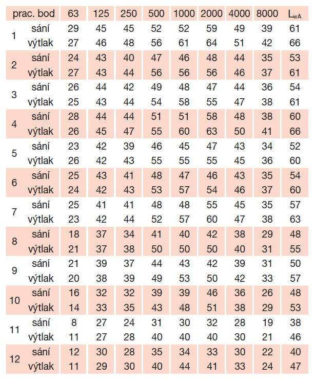 * akustický tlak je měřen ve vzdálenosti 3 m v bodě 2 výkonové křivky (sání/výtlak)