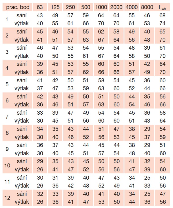 * akustický tlak je měřen ve vzdálenosti 3 m v bodě 2 výkonové křivky (sání/výtlak)