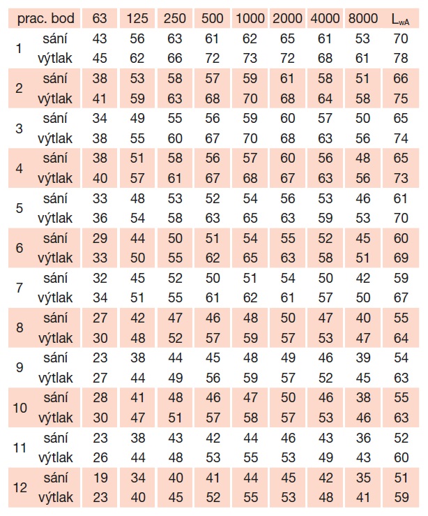 * akustický tlak je měřen ve vzdálenosti 3 m v bodě 2 výkonové křivky (sání/výtlak)