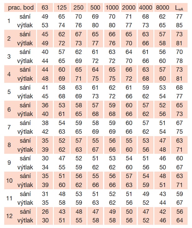 * akustický tlak je měřen ve vzdálenosti 3 m v bodě 2 výkonové křivky (sání/výtlak)