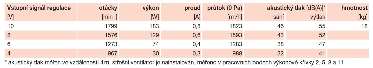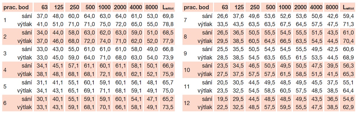 * akustický tlak měřen ve vzdálenosti 4 m, střešní ventilátor je nainstalován, měřeno v pracovních bodech výkonové křivky 2, 5, 8 a 11