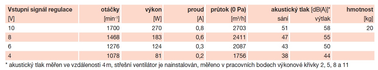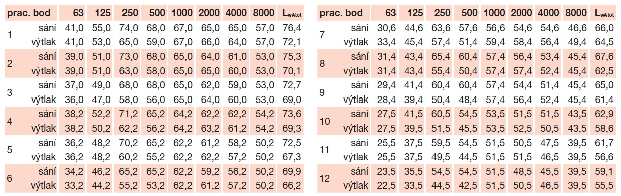 * akustický tlak měřen ve vzdálenosti 4 m, střešní ventilátor je nainstalován, měřeno v pracovních bodech výkonové křivky 2, 5, 8 a 11