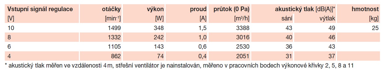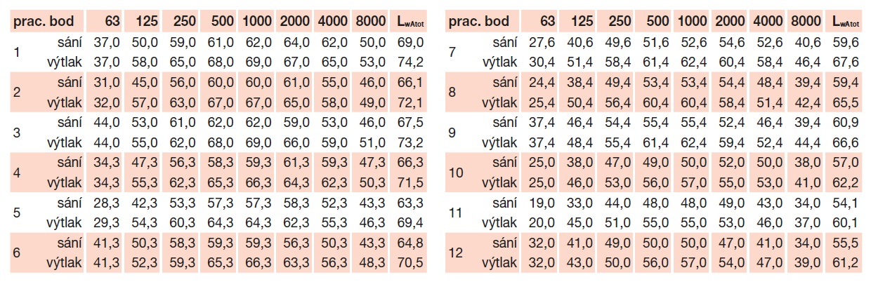 * akustický tlak měřen ve vzdálenosti 4 m, střešní ventilátor je nainstalován, měřeno v pracovních bodech výkonové křivky 2, 5, 8 a 11