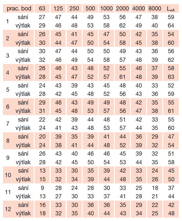 * akustický tlak je měřen ve vzdálenosti 3 m v bodě 2 výkonové křivky (sání/výtlak)