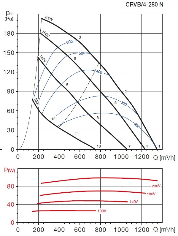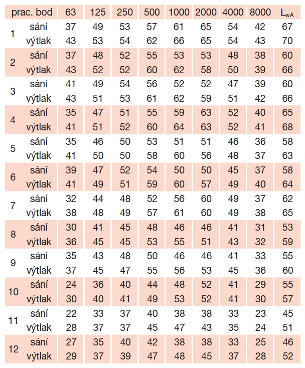 * akustický tlak je měřen ve vzdálenosti 3 m v bodě 2 výkonové křivky (sání/výtlak)