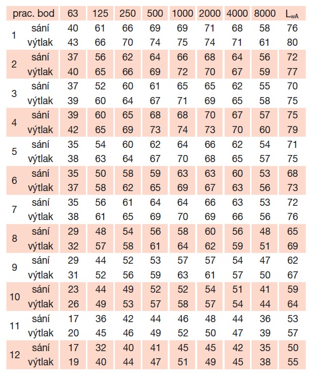 * akustický tlak je měřen ve vzdálenosti 3 m v bodě 2 výkonové křivky (sání/výtlak); ** hodnota v závorce platí v případě regulace otáček napětím