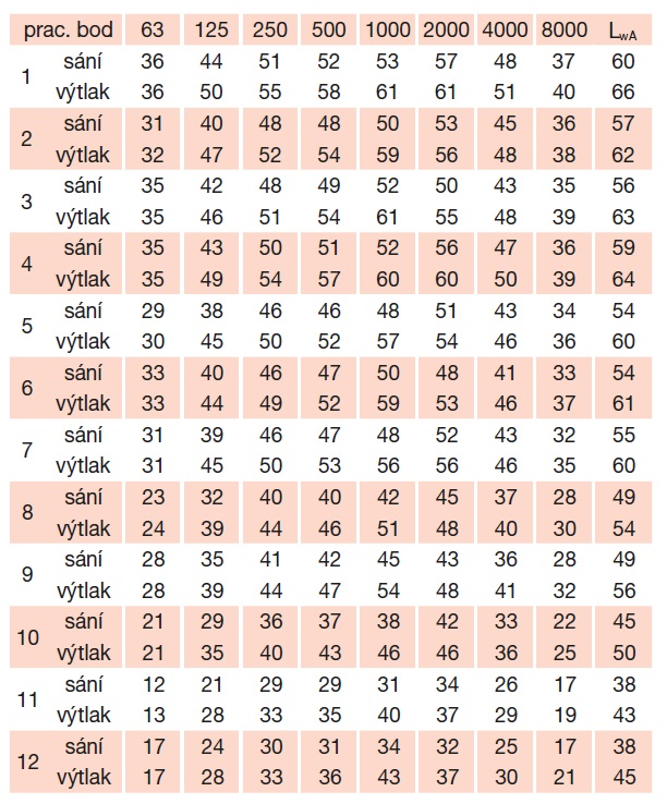 * akustický tlak je měřen ve vzdálenosti 3 m v bodě 2 výkonové křivky (sání/výtlak)