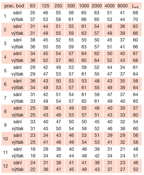 * akustický tlak je měřen ve vzdálenosti 3 m v bodě 2 výkonové křivky (sání/výtlak)