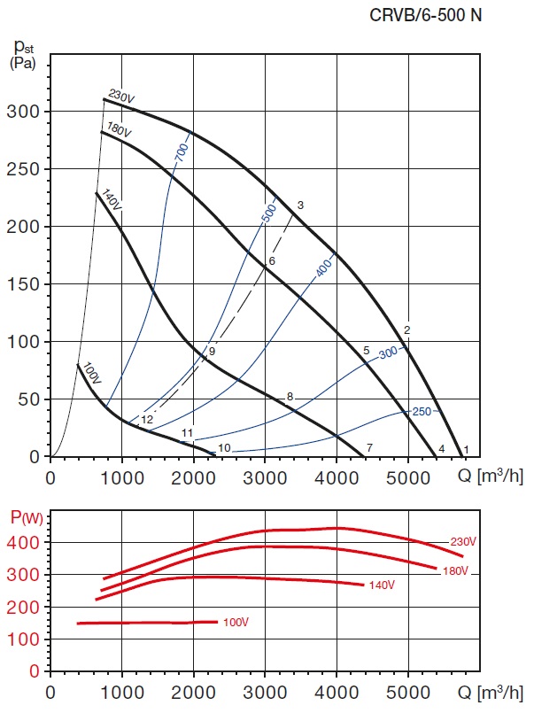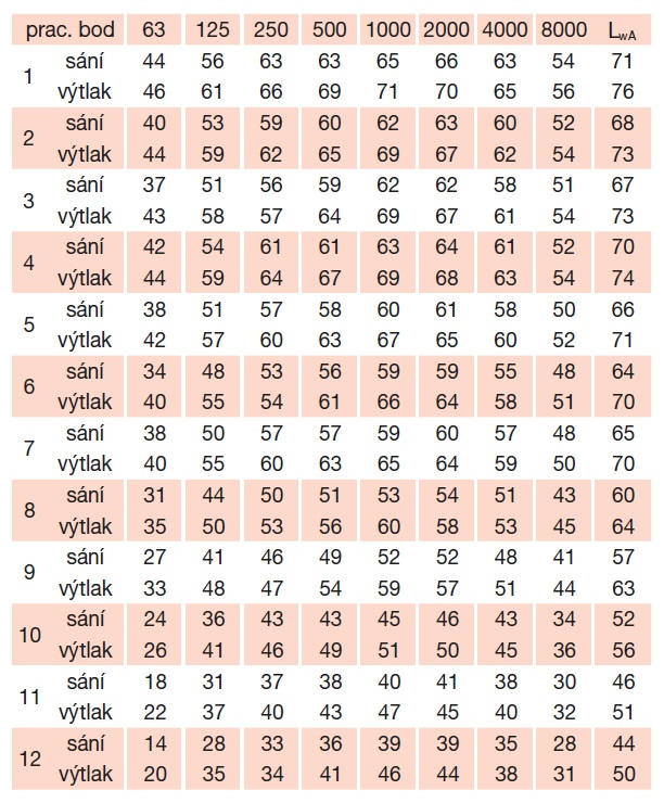 * akustický tlak je měřen ve vzdálenosti 3 m v bodě 2 výkonové křivky (sání/výtlak)
