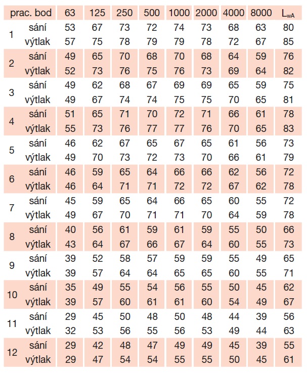 * akustický tlak je měřen ve vzdálenosti 3 m v bodě 2 výkonové křivky (sání/výtlak); ** hodnota v závorce platí v případě regulace otáček napětím