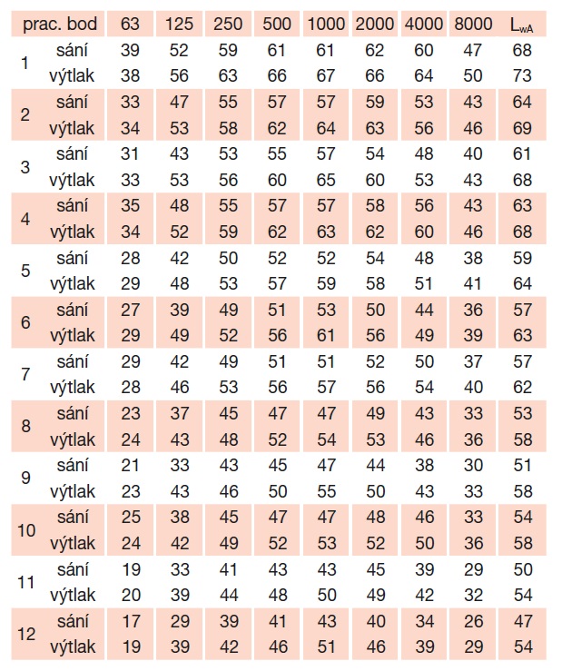 * akustický tlak je měřen ve vzdálenosti 3 m v bodě 2 výkonové křivky (sání/výtlak)