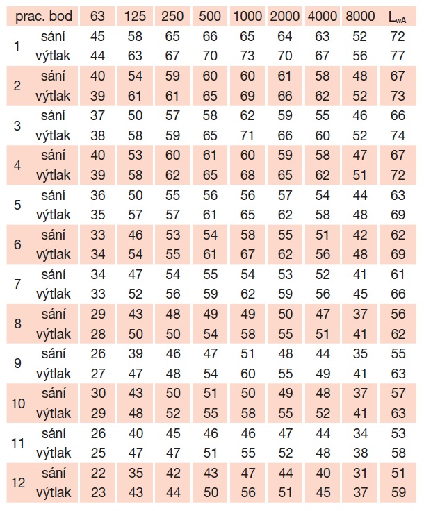 * akustický tlak je měřen ve vzdálenosti 3 m v bodě 2 výkonové křivky (sání/výtlak)