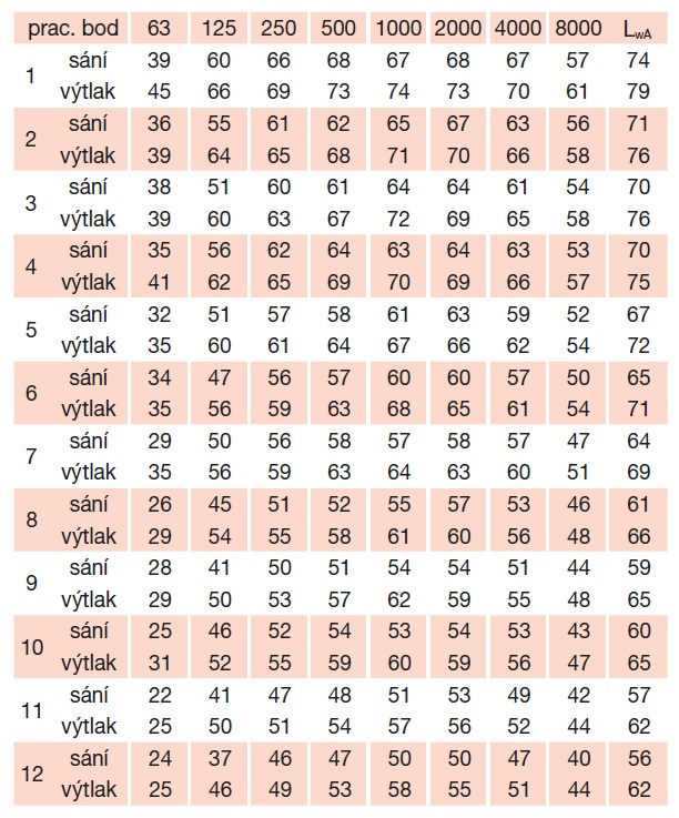* akustický tlak je měřen ve vzdálenosti 3 m v bodě 2 výkonové křivky (sání/výtlak)
