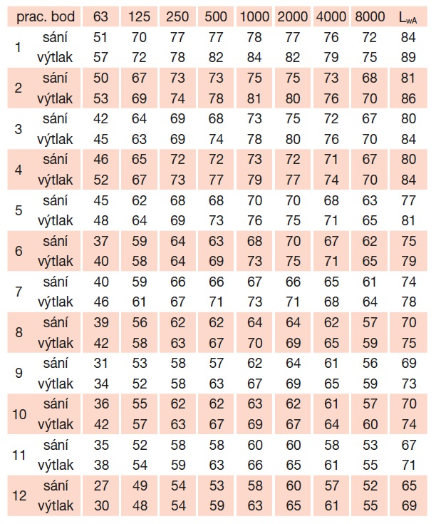 * akustický tlak je měřen ve vzdálenosti 3 m v bodě 2 výkonové křivky (sání/výtlak)