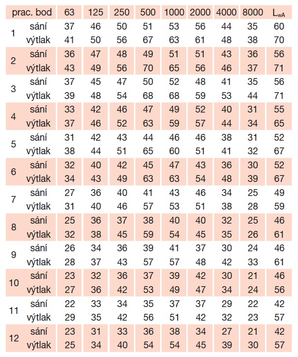 * akustický tlak je měřen ve vzdálenosti 3 m v bodě 2 výkonové křivky (sání/výtlak)