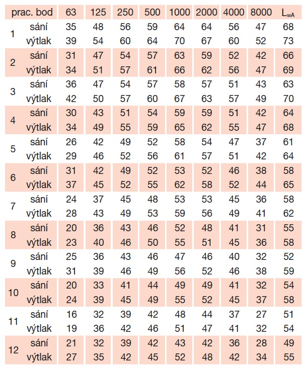 * akustický tlak je měřen ve vzdálenosti 3 m v bodě 2 výkonové křivky (sání/výtlak)