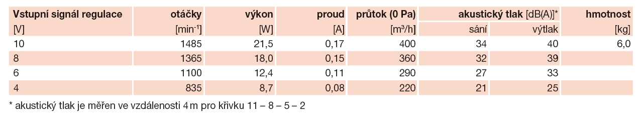 | otáčky [min-1] | výkon [W] | proud [A] | průtok (0 Pa) [m3/h] | akust. tlak - sání* [dB(A)] | akust. tlak - výtlak* [dB(A)] | hmotnost [kg] |