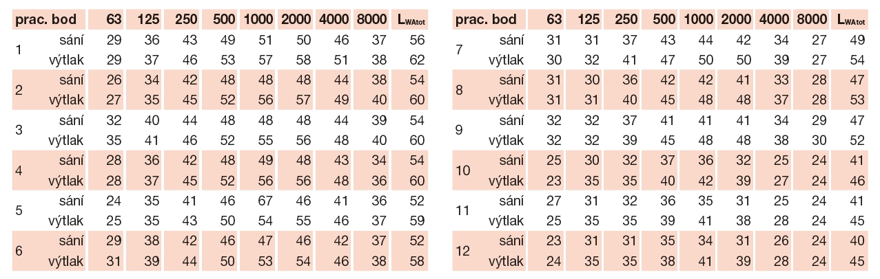 * akustický tlak je měřen ve vzdálenosti 4 m, měřeno v pracovních bodech výkonové křivky 2 – 5 – 8 a 11