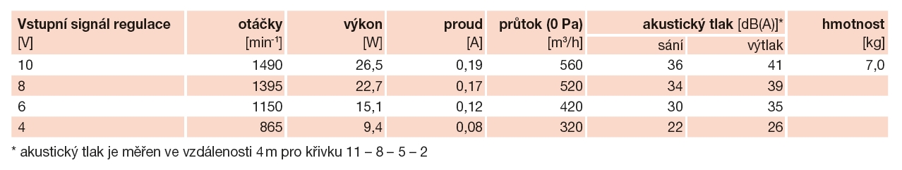 | otáčky [min-1] | výkon [W] | proud [A] | průtok (0 Pa) [m3/h] | akust. tlak - sání* [dB(A)] | akust. tlak - výtlak* [dB(A)] | hmotnost [kg] |