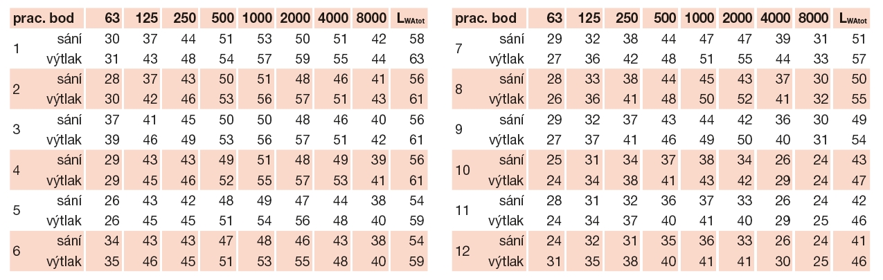 * akustický tlak je měřen ve vzdálenosti 4 m, měřeno v pracovních bodech výkonové křivky 2 – 5 – 8 a 11