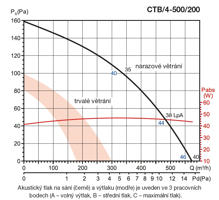 Akustický tlak LpA je měřen ve vzdálenosti 3 m v pracovním bodě ve středu charakteristiky ventilátoru