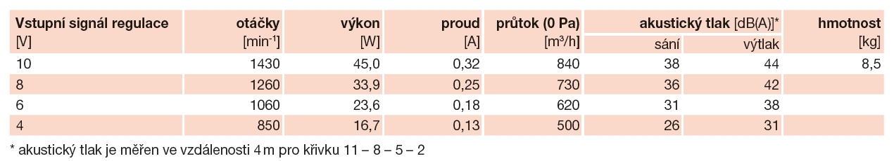 | otáčky [min-1] | výkon [W] | proud [A] | průtok (0 Pa) [m3/h] | akust. tlak - sání* [dB(A)] | akust. tlak - výtlak* [dB(A)] | hmotnost [kg] |