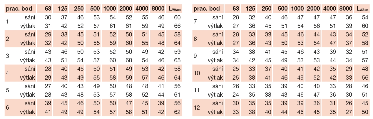 * akustický tlak je měřen ve vzdálenosti 4 m, měřeno v pracovních bodech výkonové křivky 2 – 5 – 8 a 11