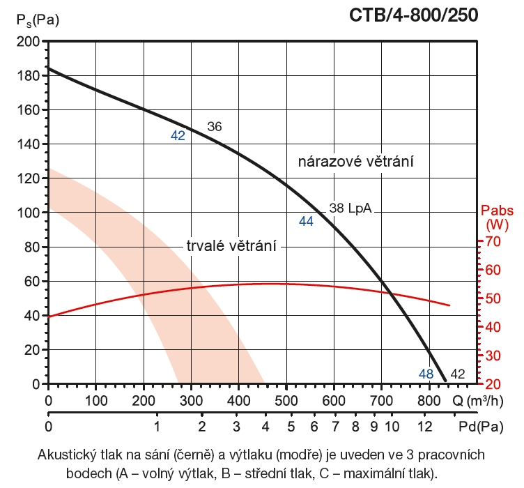 Akustický tlak LpA je měřen ve vzdálenosti 3 m v pracovním bodě ve středu charakteristiky ventilátoru
