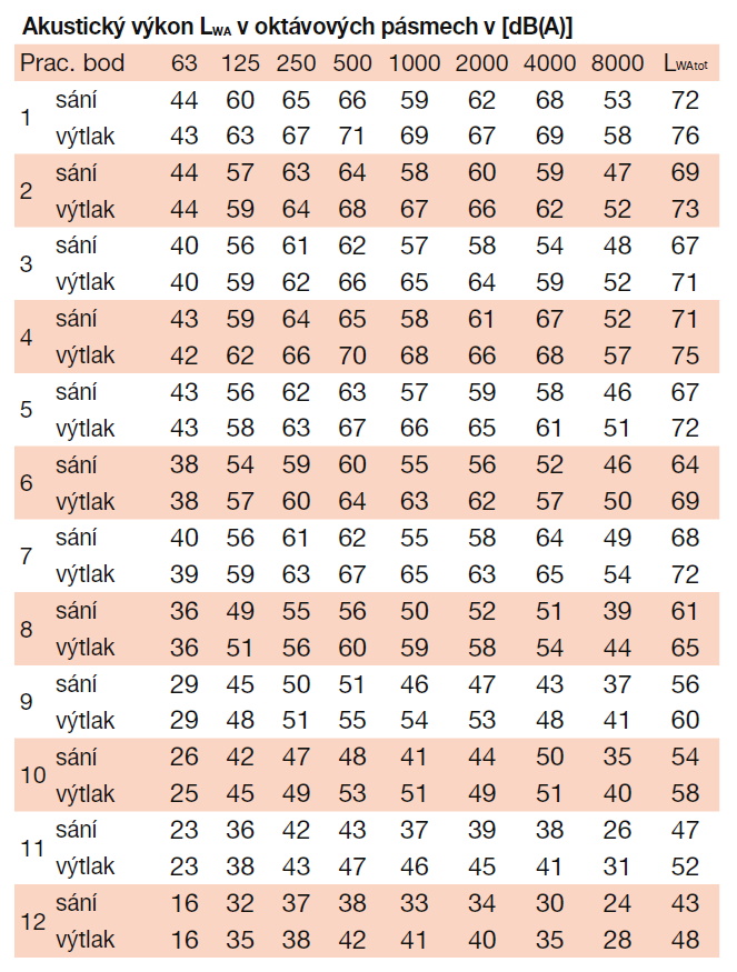 ![]() | Hluk Hluk emitovaný ventilátorem je uveden v tabulkách. Hodnoty LpA na výkonových charakteristikách jsou měřeny ve volném poli na straně sání ve vzdálenosti 1,5 m. | |
