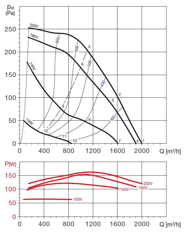 | otáčky [min-1] | příkon [W] | proud [A] | průtok (0 Pa) [m3/h] | napětí [V] | teplota [°C] | akust. tlak - sání [dB(A)] | akust. tlak - výtlak [dB(A)] | hmot. [kg] | velikost přísl. | regulátor |