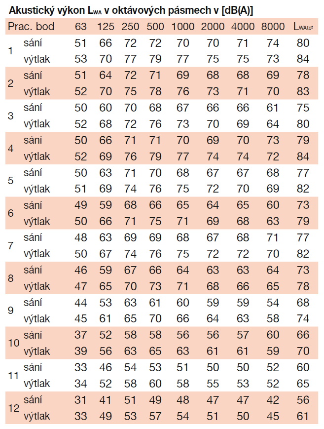 ![]() | Hluk Hluk emitovaný ventilátorem je uveden v tabulkách. Hodnoty LpA na výkonových charakteristikách jsou měřeny ve volném poli na straně sání ve vzdálenosti 1,5 m. | |