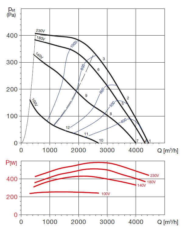 | otáčky [min-1] | příkon [W] | proud [A] | průtok (0 Pa) [m3/h] | napětí [V] | teplota [°C] | akust. tlak - sání [dB(A)] | akust. tlak - výtlak [dB(A)] | hmot. [kg] | velikost přísl. | regulátor |