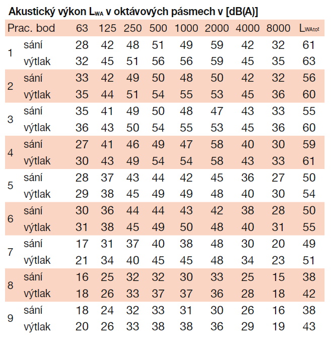 ![]() | Hluk Hluk emitovaný ventilátorem je uveden v tabulkách. Hodnoty LpA na výkonových charakteristikách jsou měřeny ve volném poli na straně sání ve vzdálenosti 1,5 m. | |
