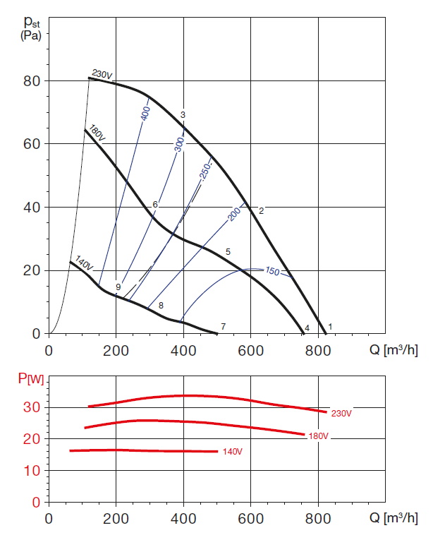 | otáčky [min-1] | příkon [W] | proud [A] | průtok (0 Pa) [m3/h] | napětí [V] | teplota [°C] | akust. tlak - sání [dB(A)] | akust. tlak - výtlak [dB(A)] | hmot. [kg] | velikost přísl. | regulátor |