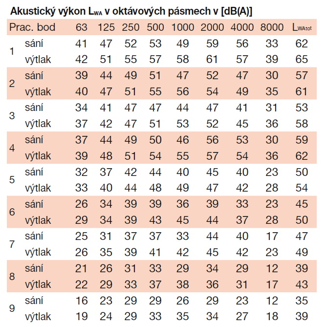 ![]() | Hluk Hluk emitovaný ventilátorem je uveden v tabulkách. Hodnoty LpA na výkonových charakteristikách jsou měřeny ve volném poli na straně sání ve vzdálenosti 1,5 m. | |