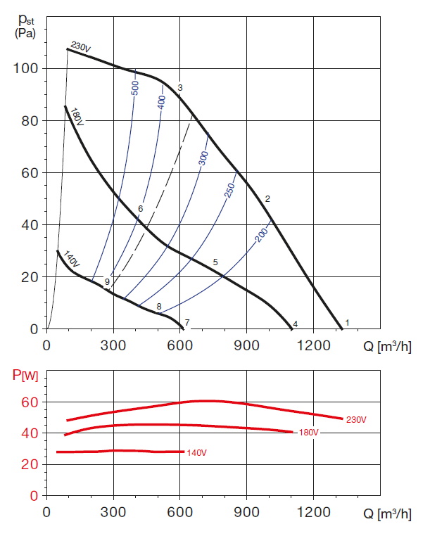 | otáčky [min-1] | příkon [W] | proud [A] | průtok (0 Pa) [m3/h] | napětí [V] | teplota [°C] | akust. tlak - sání [dB(A)] | akust. tlak - výtlak [dB(A)] | hmot. [kg] | velikost přísl. | regulátor |